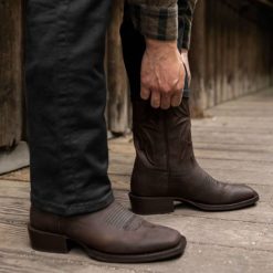 der unverzichtbare Cowboystiefel mit quadratischer Zehenpartie. Handgefertigt mit Goodyear-Rahmenkonstruktion, markanten Westernschaftnähten und -paspeln, bequemen Poron-Einlegesohlen, langlebigen Gummilaufsohlen und unserem berühmten, robusten, widerstandsfähigen Leder. Der Desperado repräsentiert westliche Tradition und altehrwürdige Handwerkskunst für unabhängige Männer, die hart arbeiten, keine Angst davor haben, die Dinge auf ihre eigene Weise zu tun, und einen Stiefel brauchen, um selbstbewusst im Takt ihrer eigenen Trommel zu marschieren.